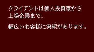 当社日本人スタッフは1980年代初期から米国内でビジネスに携わってきました。これまでの顧客は、個人投資家、出来て間もない無名の個人企業、将来有望なベンチャー企業、有力中堅企業、大手メーカー、財閥系の大企業、NY証券取引所やナスダックで上場されている有力米企業、IT系ベンチャー米企業などを含みます。